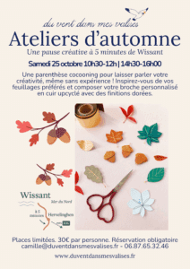 Sous les lumières dorées de la Côte d’Opale, Du vent dans mes valises vous invite à profiter des vacances de Toussaint pour participer à des ateliers créatifs collectifs éphémères aux thématiques saisonnières. Choisissez votre feuille préférée parmi plusieurs modèles (chêne, érable, feuille stylisée…) et réalisez votre broche en cuir upcyclé aux finitions finitions élégantes. Selon le temps, vous pourrez également réaliser un petit pin’s noisette coordonné. Ces ateliers à prix doux sont conçus pour un public adulte (ou duo parent/enfant), dans une atmosphère cocooning inspirée de l’automne.