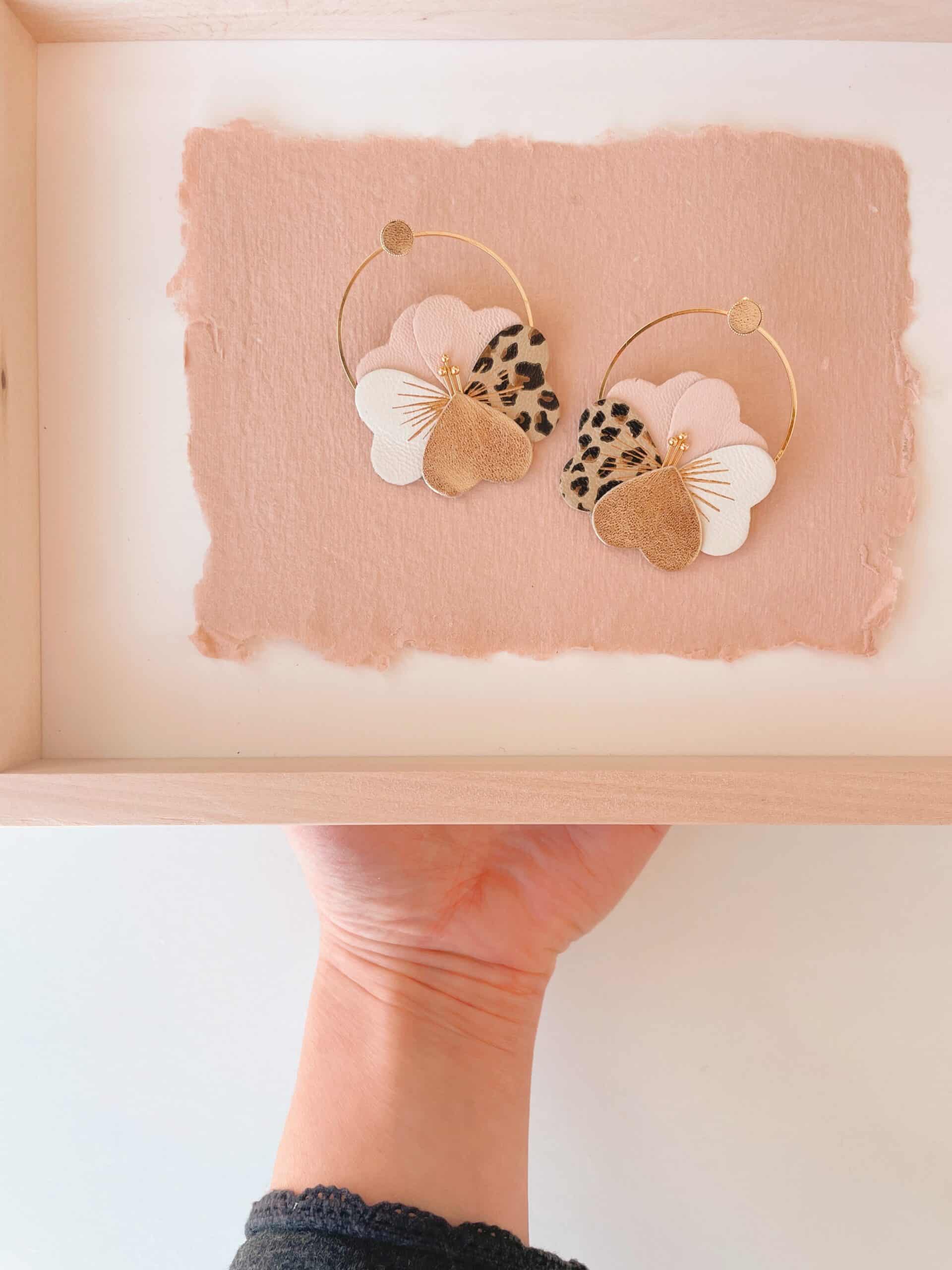 Deux pensées stylisées, posées sur un cerceau doré : une note florale élégante, reconnaissable entre toutes. Cinq pétales, quelques nervures fines en dorure à chaud à l’or fin, et de délicates étamines en laiton doré qui accrochent la lumière avec retenue. Extrêmement légères malgré leur taille, elles se portent du quotidien aux jours de cérémonie, comme un détail précieux. Déclinées en éditions limitées de coloris saisonniers, elles peuvent aussi être réalisées sur commande dans une palette personnalisée.