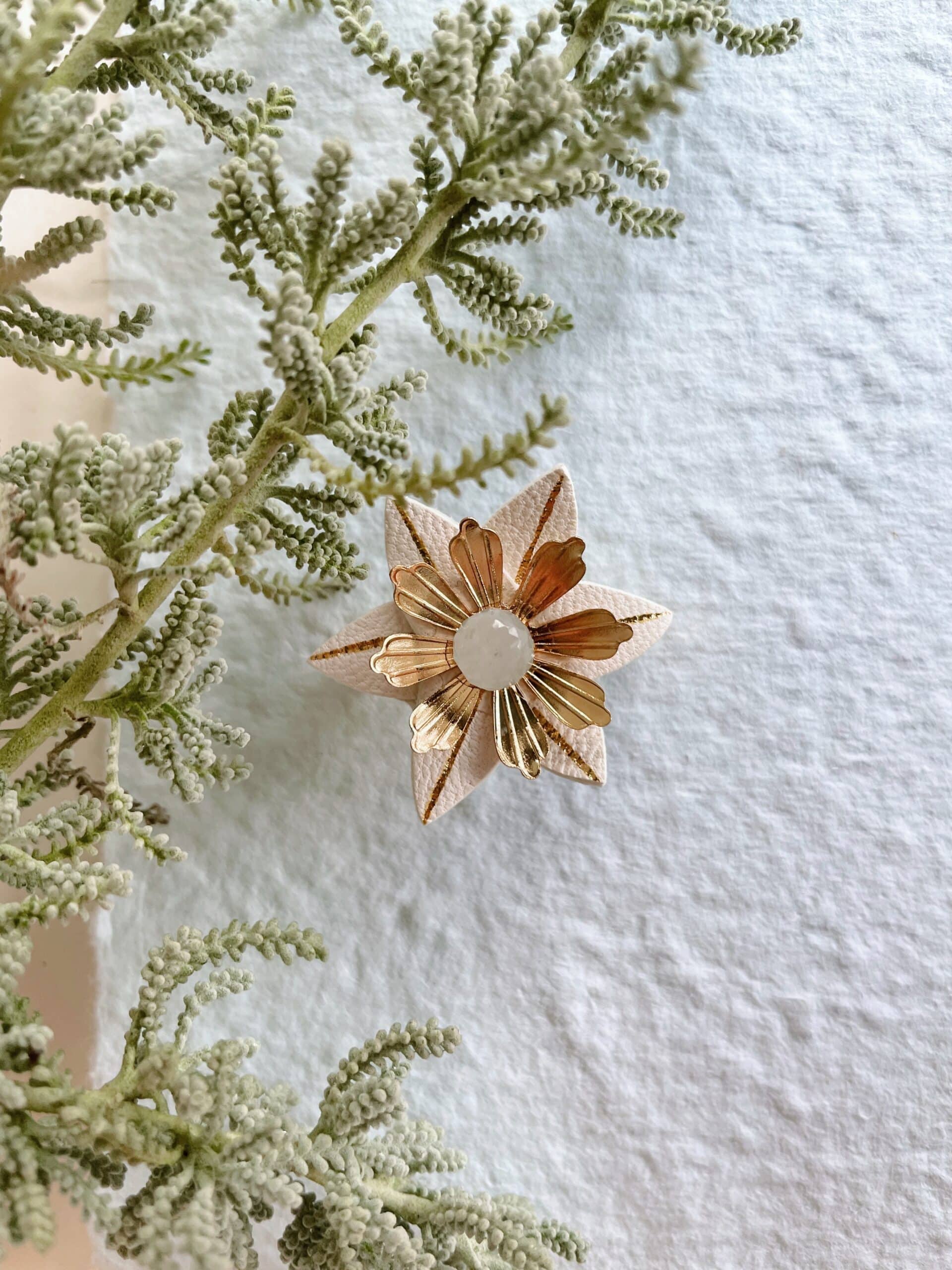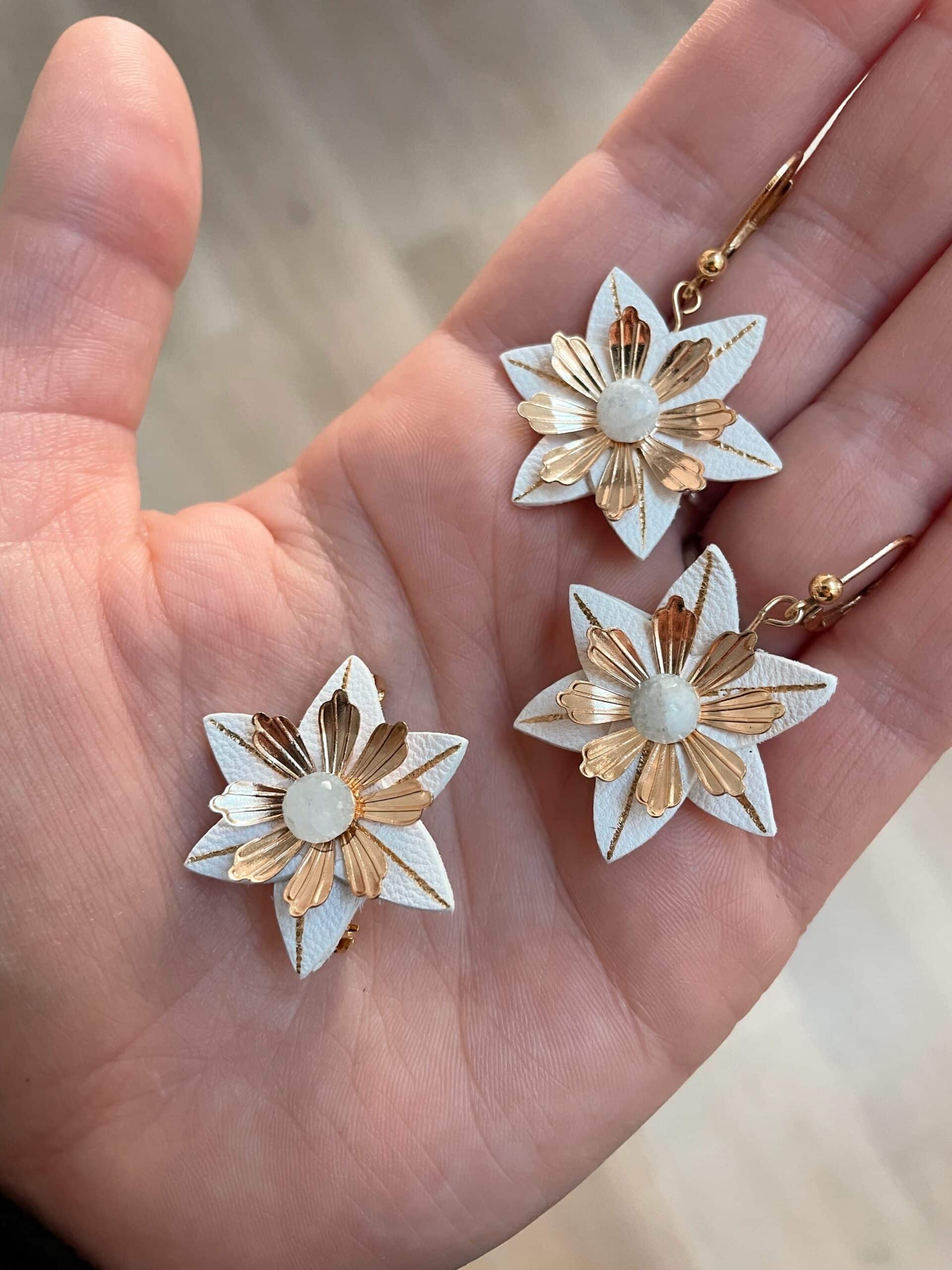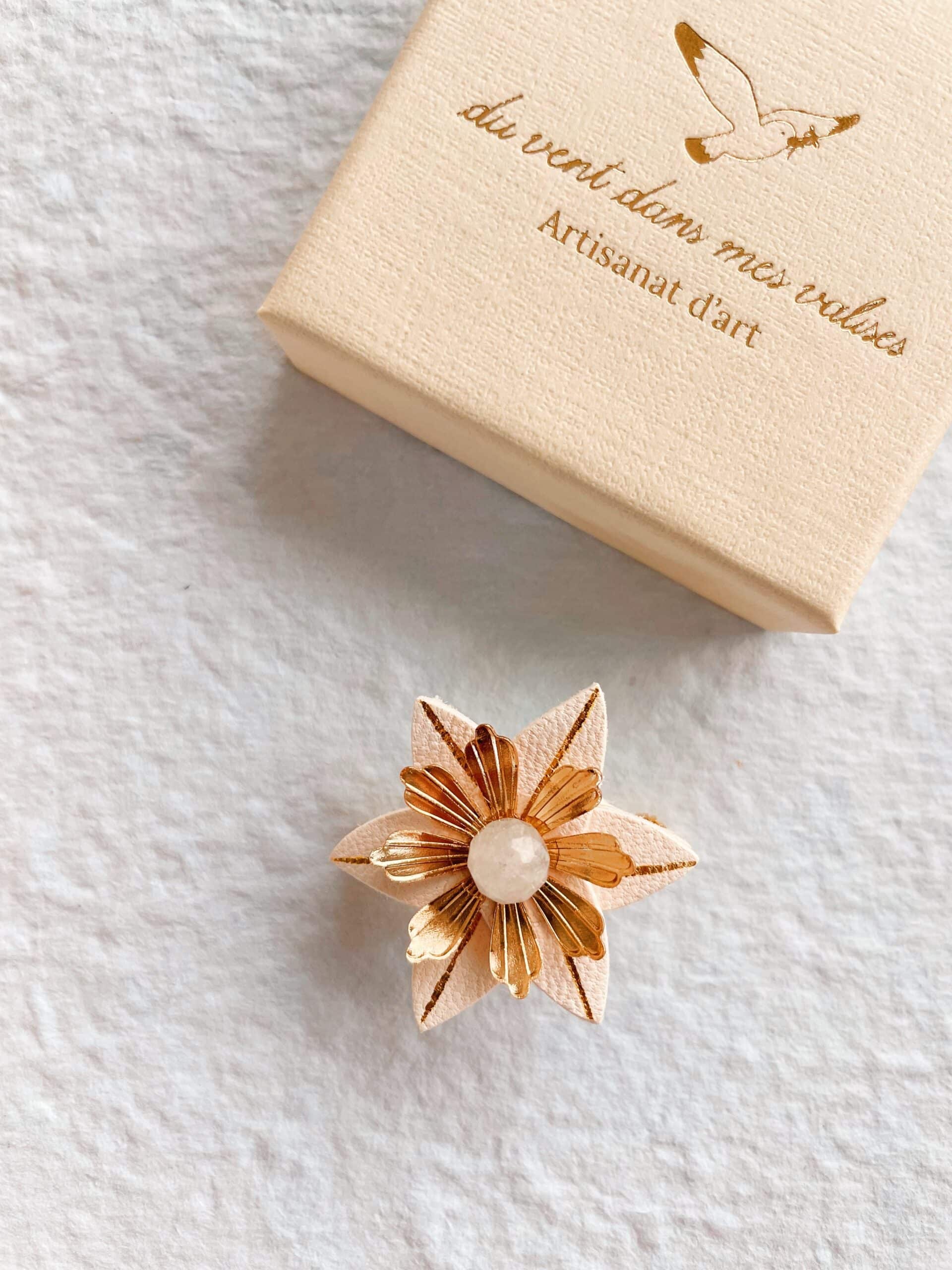 Cette jolie broche edelweiss, aussi appelée étoile des neiges ou d’argent, est considérée comme une éternelle ou immortelle qui porte chance. Avec ses nervures dorées à chaud à l’or véritable c’est un ravissant bijou floral en cuir surcyclé. Elle est confectionnée de façon artisanale par mes soins dans mon atelier sur la terre des 2 caps (côte d’opale en France). Chaque pétale est minutieusement découpé à la main et chaque fleur est ensuite ennoblie avec un procédé traditionnel de dorure à chaud. Chaque pièce est donc unique. Elle est réalisée à partir d’excédents et coupons de cuir dans une démarche responsable de valorisation des matières premières (upcycling). Il s’agit de cuir d’ovins de provenance française. Le fermoir et les dormeuses en laiton sont dorés à l’or fin à Paris. Comme il s’agit de chutes de cuir, les coloris peuvent varier légèrement.