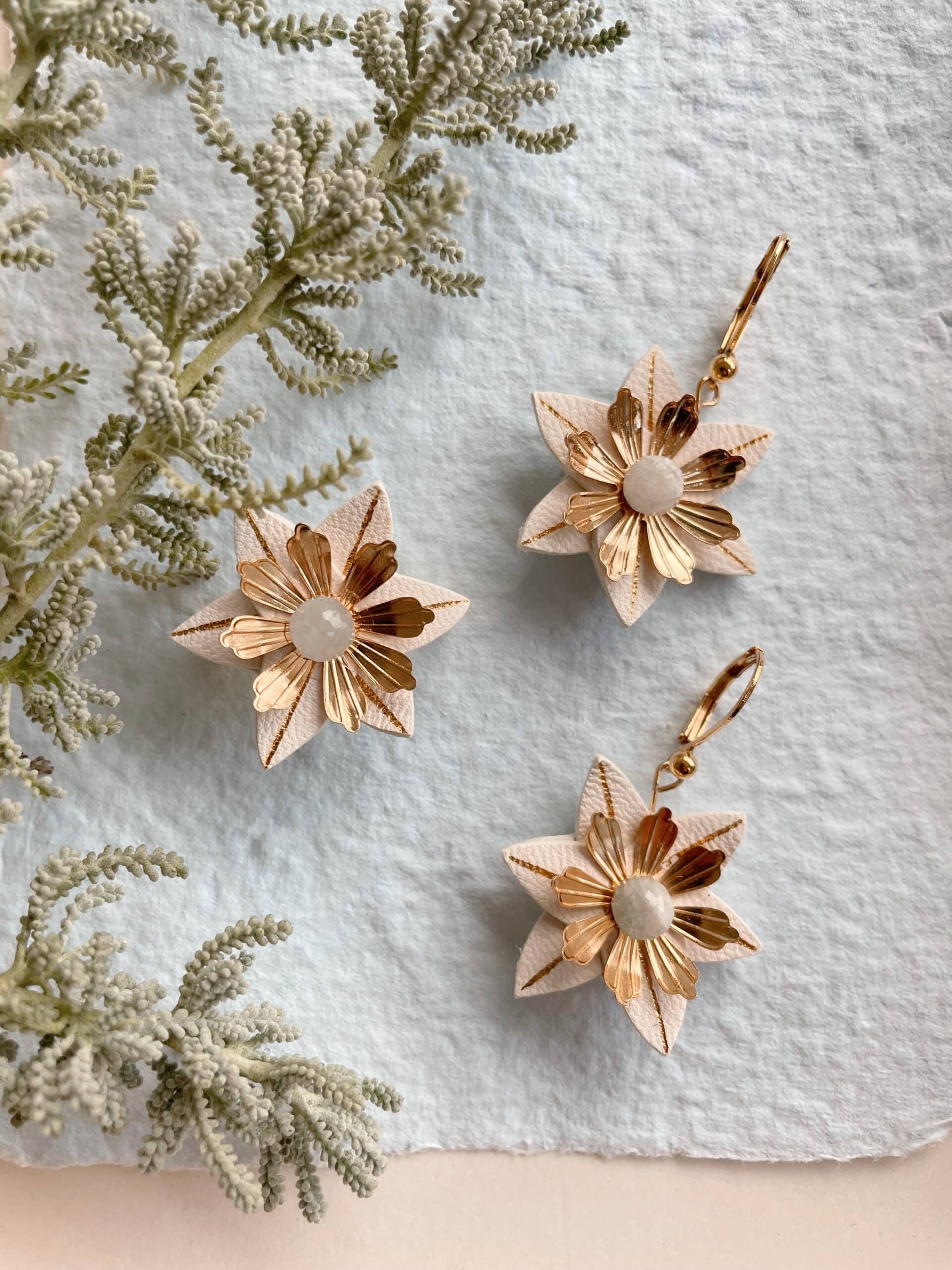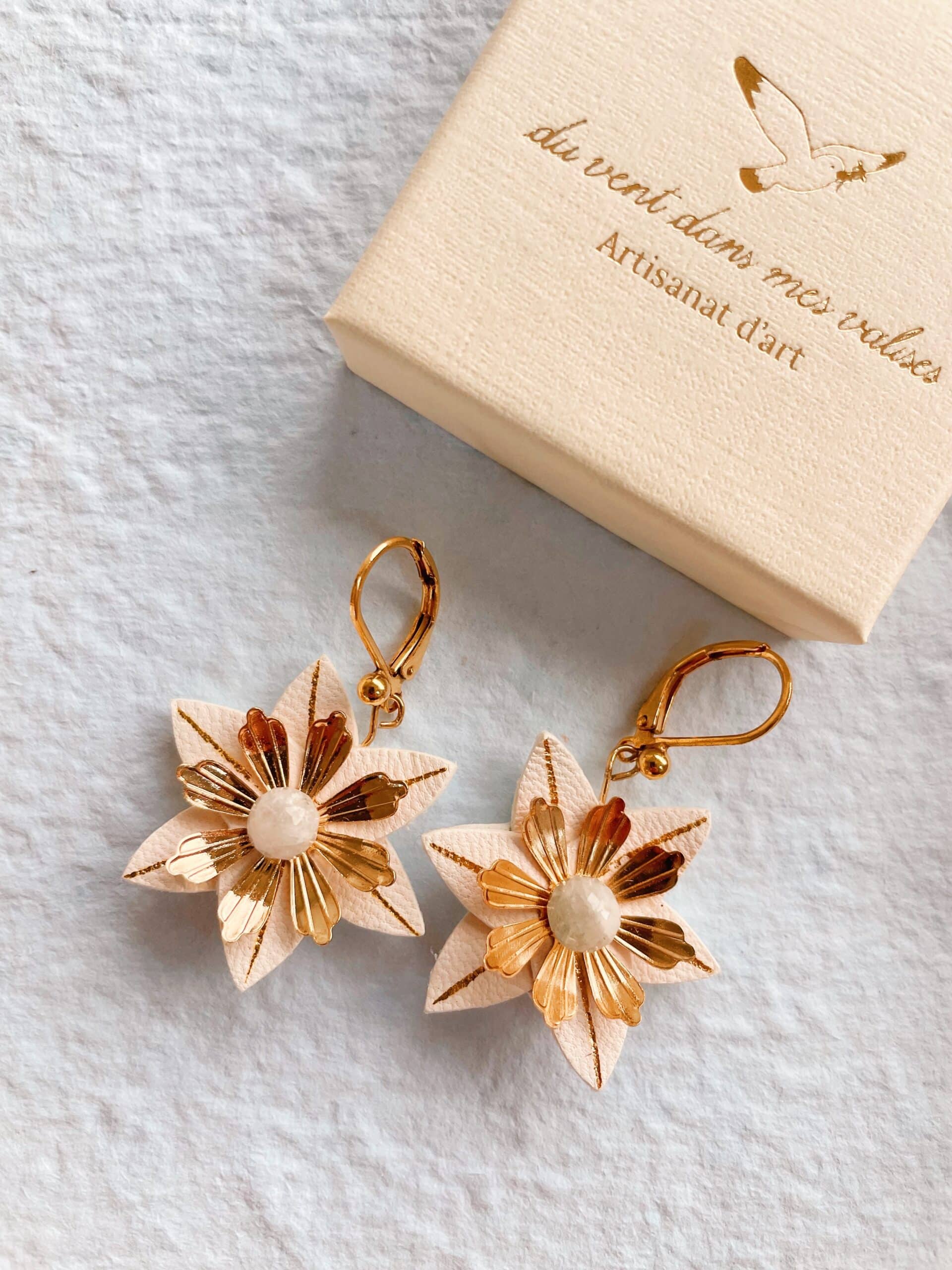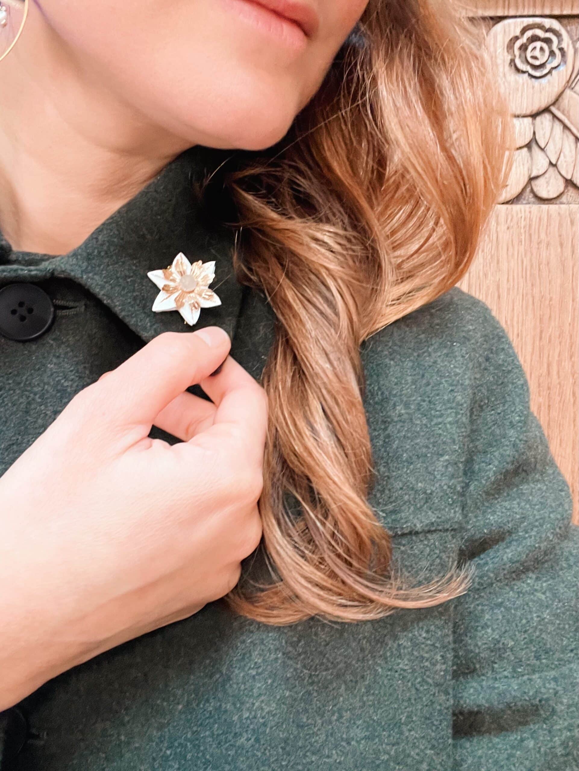 Cette jolie broche edelweiss, aussi appelée étoile des neiges ou d’argent, est considérée comme une éternelle ou immortelle qui porte chance. Avec ses nervures dorées à chaud à l’or véritable c’est un ravissant bijou floral en cuir surcyclé. Elle est confectionnée de façon artisanale par mes soins dans mon atelier sur la terre des 2 caps (côte d’opale en France). Chaque pétale est minutieusement découpé à la main et chaque fleur est ensuite ennoblie avec un procédé traditionnel de dorure à chaud. Chaque pièce est donc unique. Elle est réalisée à partir d’excédents et coupons de cuir dans une démarche responsable de valorisation des matières premières (upcycling). Il s’agit de cuir d’ovins de provenance française. Le fermoir et les dormeuses en laiton sont dorés à l’or fin à Paris. Comme il s’agit de chutes de cuir, les coloris peuvent varier légèrement.