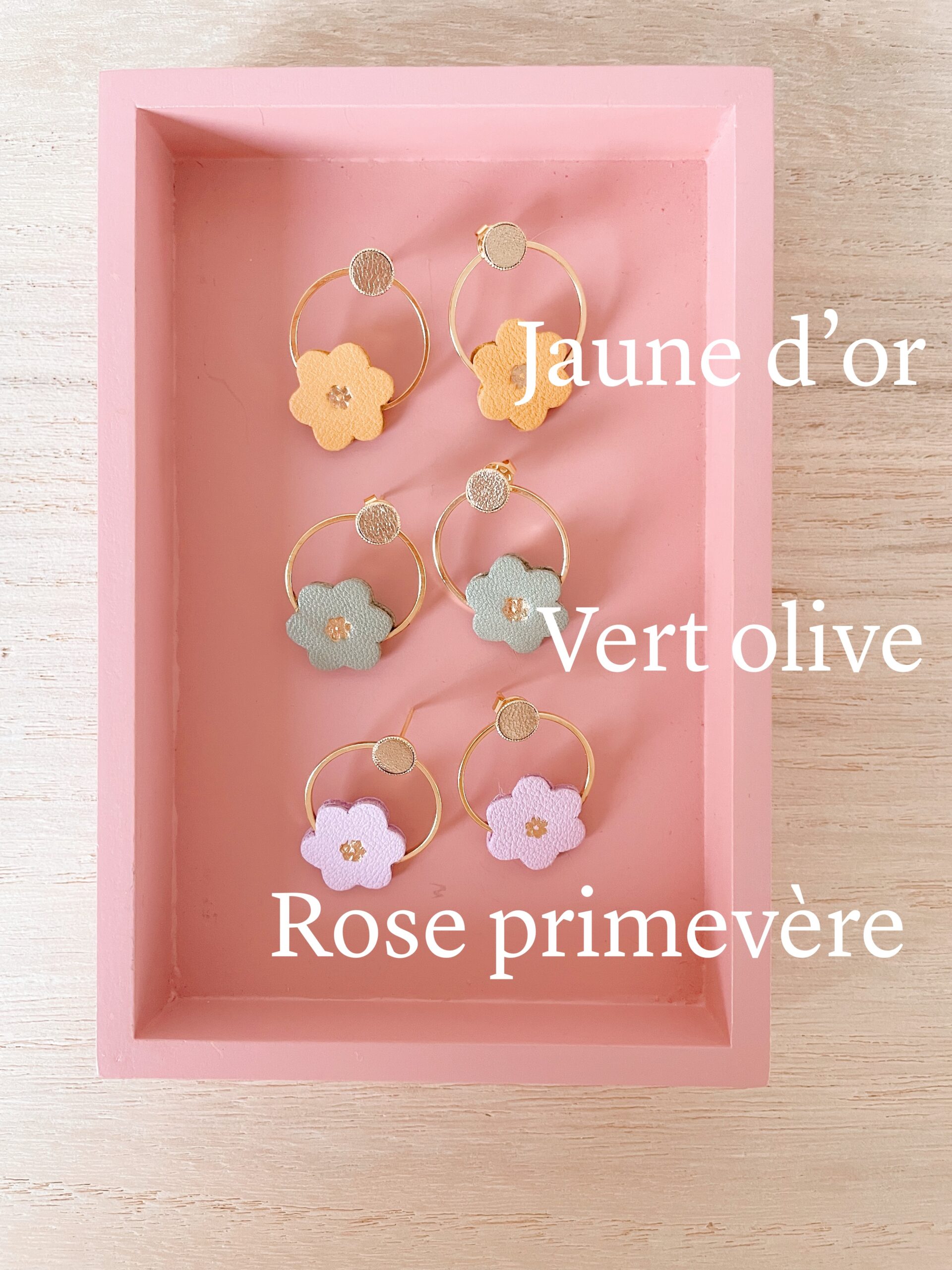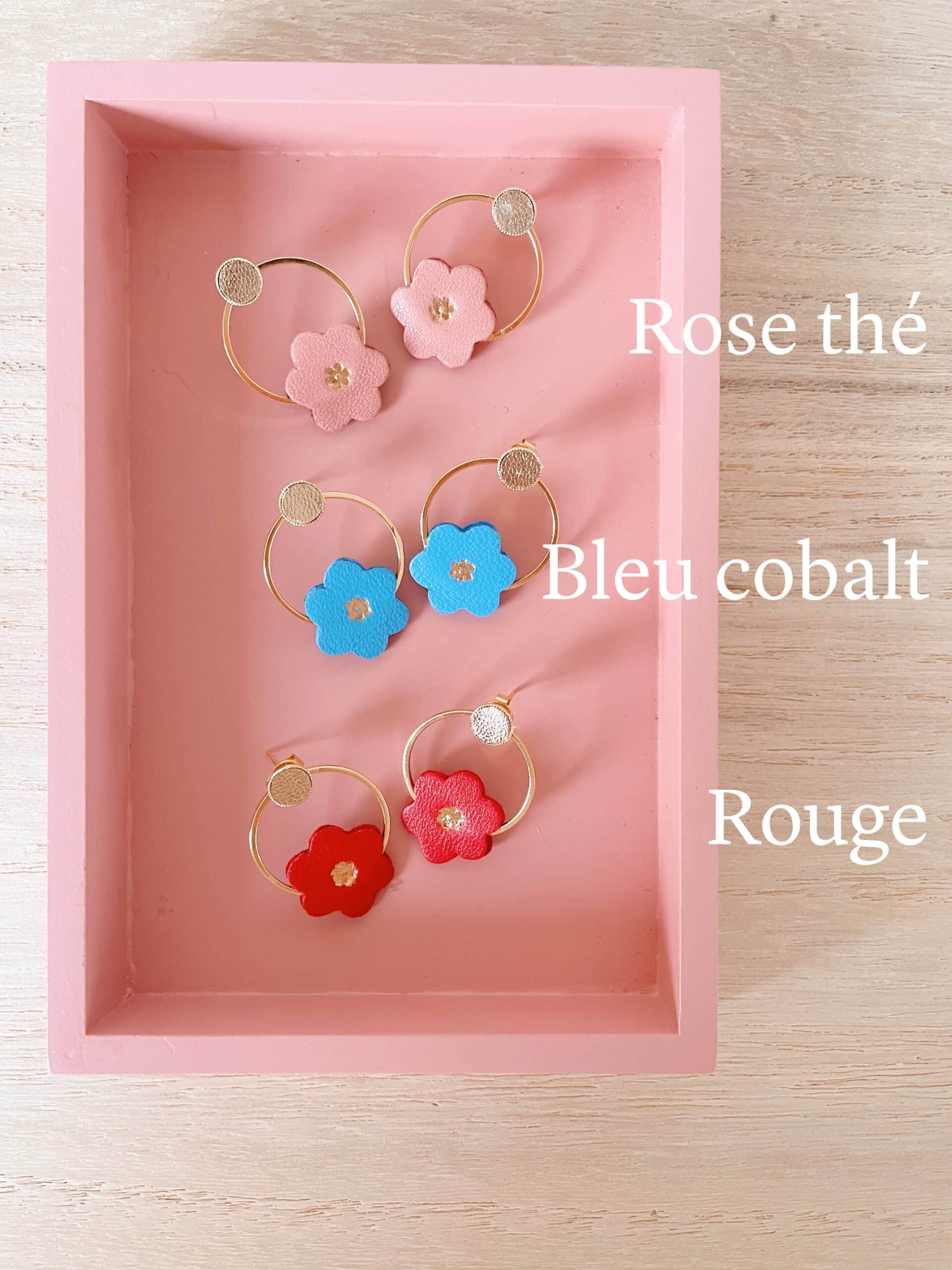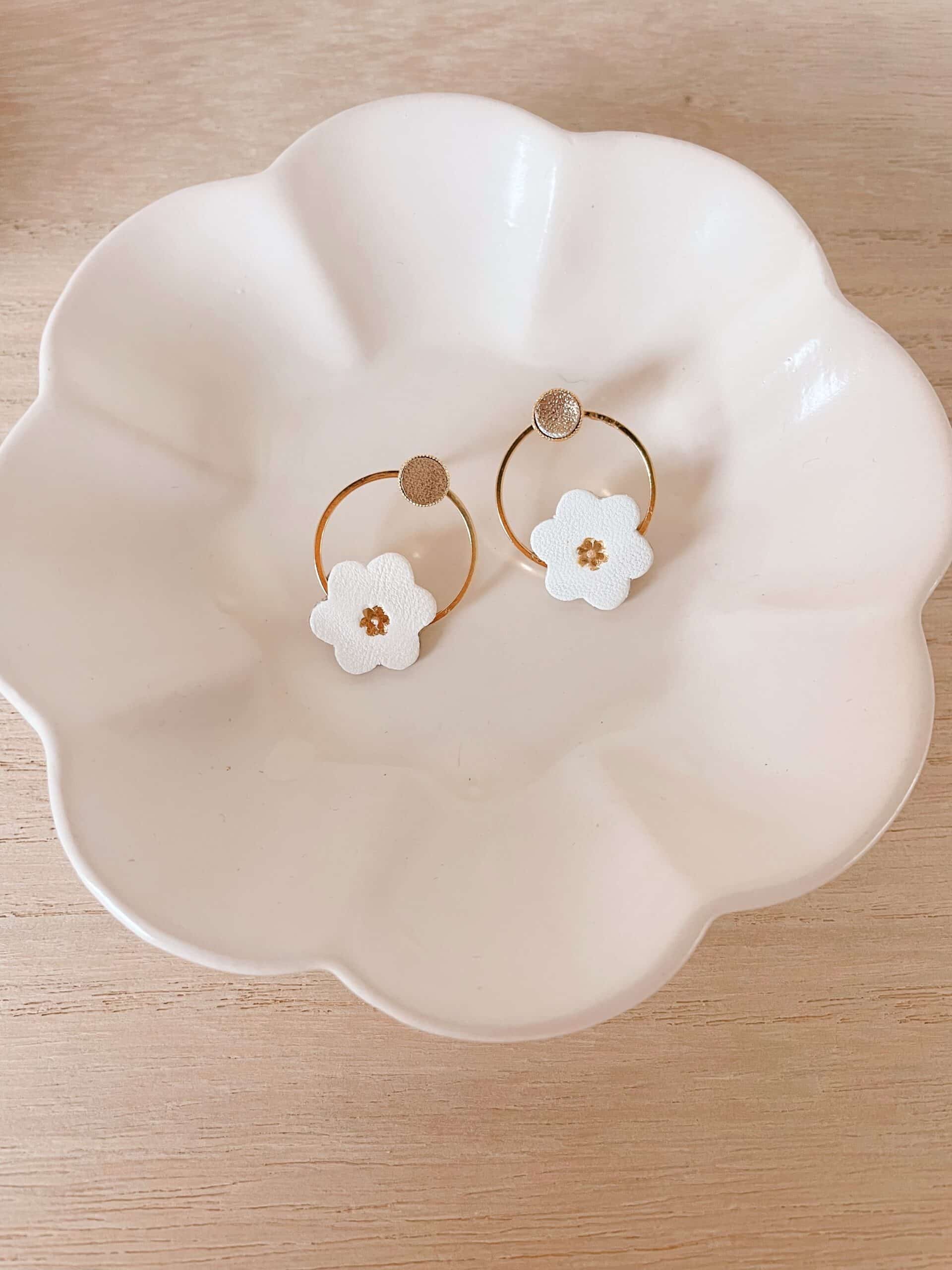 Une seule petite corolle, comme une signature. Découpée en cuir surcyclé puis rehaussée d’un cœur doré à l’or fin, elle vient se poser sur un fin anneau doré, et éclaire le visage d’un éclat discret. Tout est dans la mesure : la rondeur du cerceau, la fleur minuscule, la lumière qui se reflète juste au coeur de la corolle. En blanc doux, elles se font intemporelles ; en variantes saisonnières — bleu cobalt, rouge, rose thé, jaune d’or, vert olive, rose primevère — elles apportent une touche de couleur fraîche, graphique et joyeuse, sans rien perdre de leur élégance.